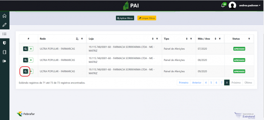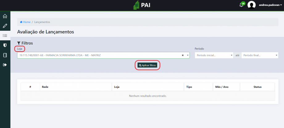 Loja: Buscar pelo CNPJ ou Razão social e clicar em “Aplicar filtros”
