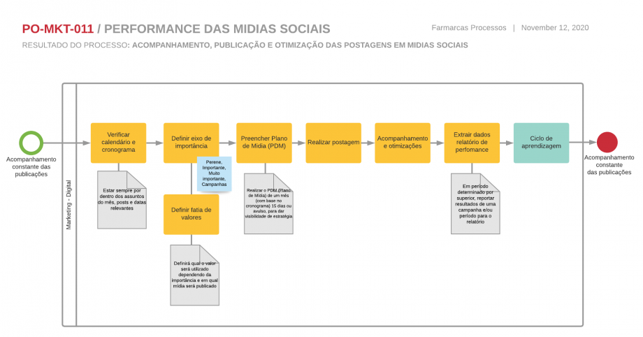O processo de performance das mídias sociais é o acompanhamento constante das publicações das redes sociais com o time de digital do Marketing, verificando mensalmente o cronograma de postagens programadas, definindo valores e importâncias dos assuntos, postando e monitorando as mídias sociais.