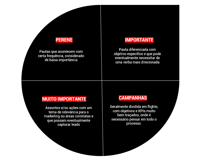 Perene, importante, muito importante, campanhas (essa definição pode ser baseada em valores, é preciso saber quanto que eu tenho para gastar no mês com mídias para entender a divisão desses valores determinando quanto é gasto em cada nível de importância para classificar no eixo)