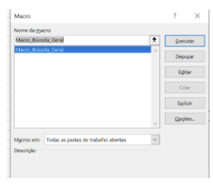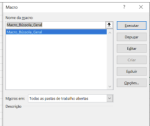 Abrir o arquivo “Macro_Bússola_Geral Atualizada”, e executar a MACRO “Macro_Bússola_Geral”