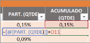 Na coluna “S”, realizar o cálculo do acumulado referente a informação de Valores. A primeira célula deve conter o mesmo valor da célula de participação(S2=R2);