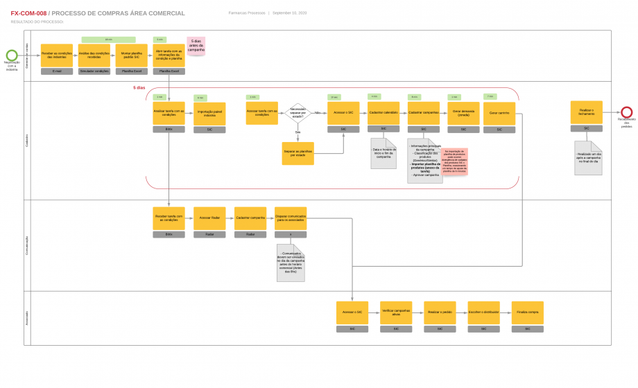 O processo de compra da área comercial são divididos em 3 frentes, sendo eles: Compra Centralizada, Sic Turbo e Sic HBN. Esses processos tem como objetivo cadastrar no sistema de compras da Farmarcas, as condições comerciais negociadas pelos Gerentes de Contas com as industrias e distribuidores parceiros, para que as nossas lojas possam comprar com as melhores negociações do mercado.
