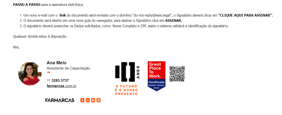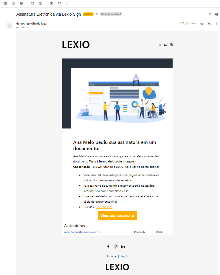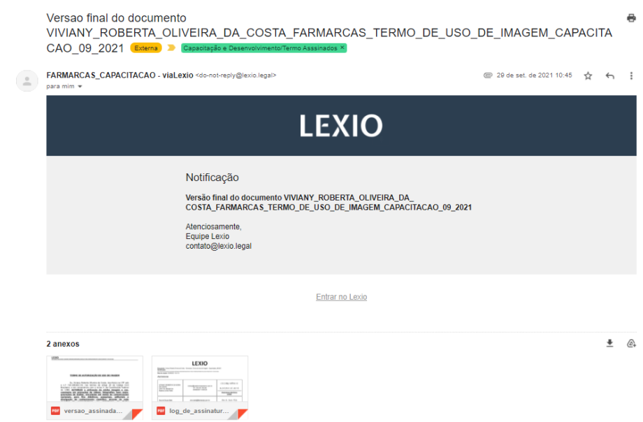 Após a assinatura de todos os envolvidos, ambos receberão um e-mail enviado pela plataforma da Lexio com o termo em PDF assinado.