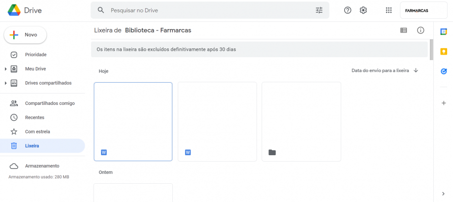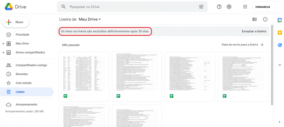Nessa aba, está concentrado todos os arquivos que foram excluídos recentemente e serão excluídos definitivamente após 30 dias.