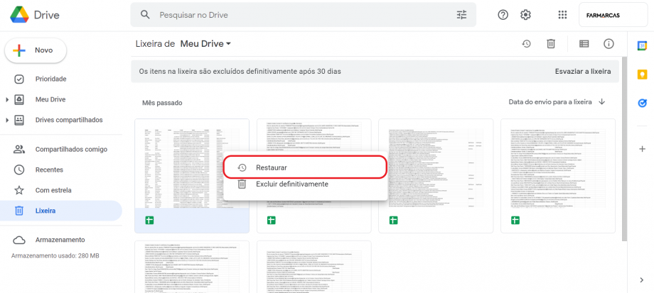 Caso você queira recuperar um arquivo da lixeira que não tenha excedido o tempo de 30 dias, clique no arquivo desejado com o botão direito do mouse e selecione “recuperar”.