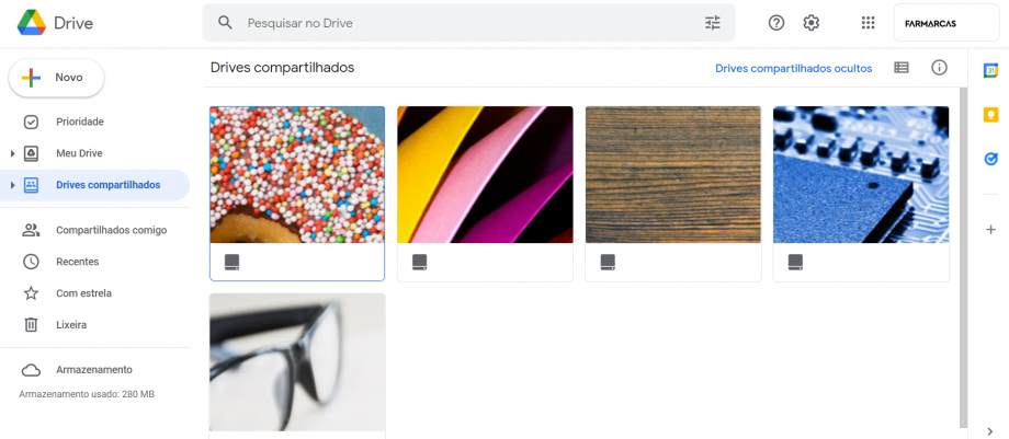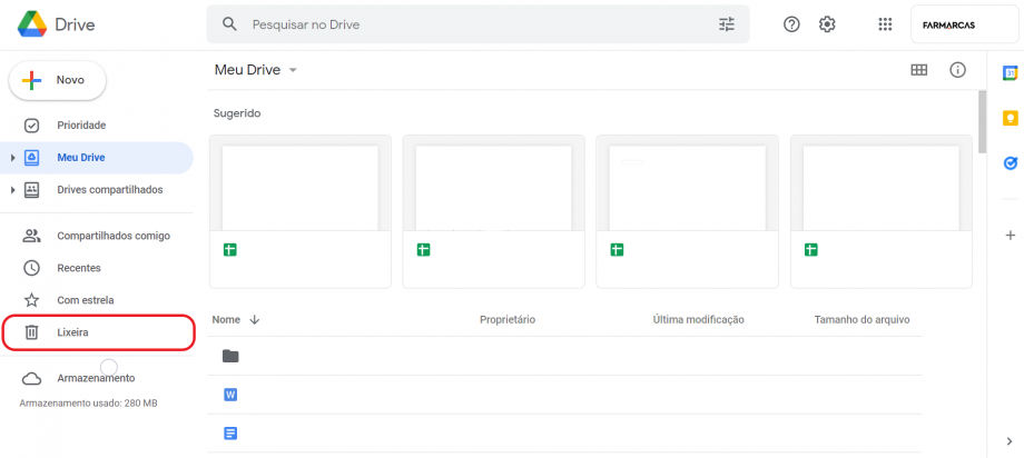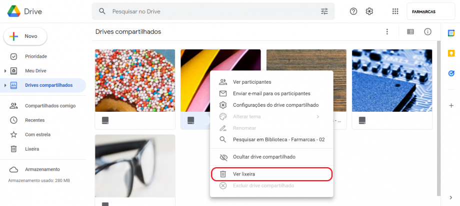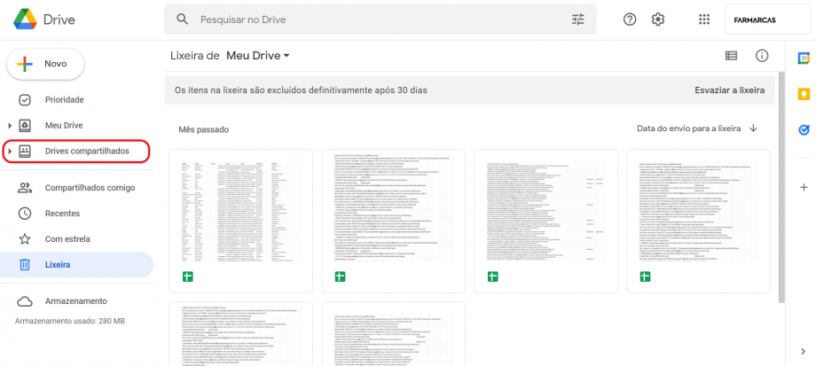Para acessar as lixeiras do seu drive compartilhado, localize o menu lateral e clique em “Drive Compartilhado”