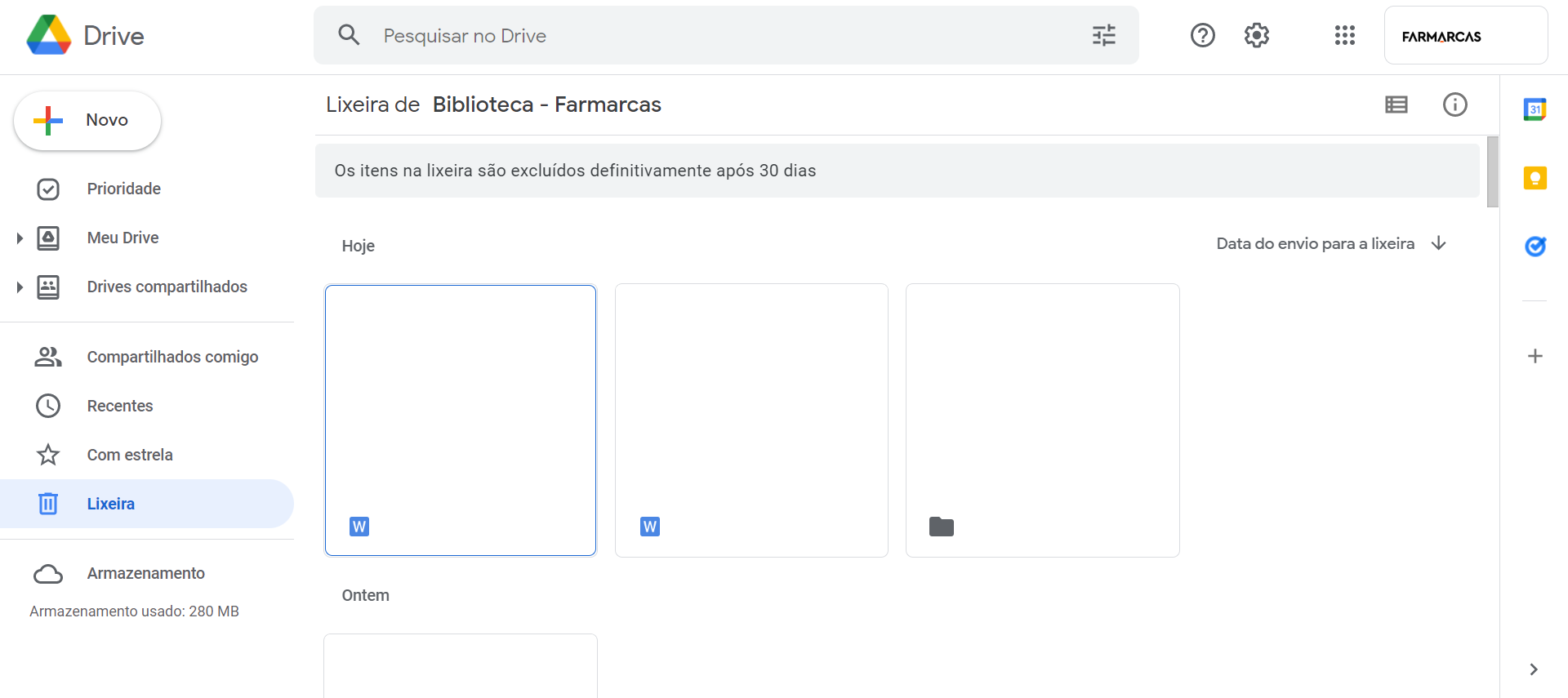 Nessa aba, está concentrado todos os arquivos que foram excluídos recentemente e serão excluídos definitivamente após 30 dias.