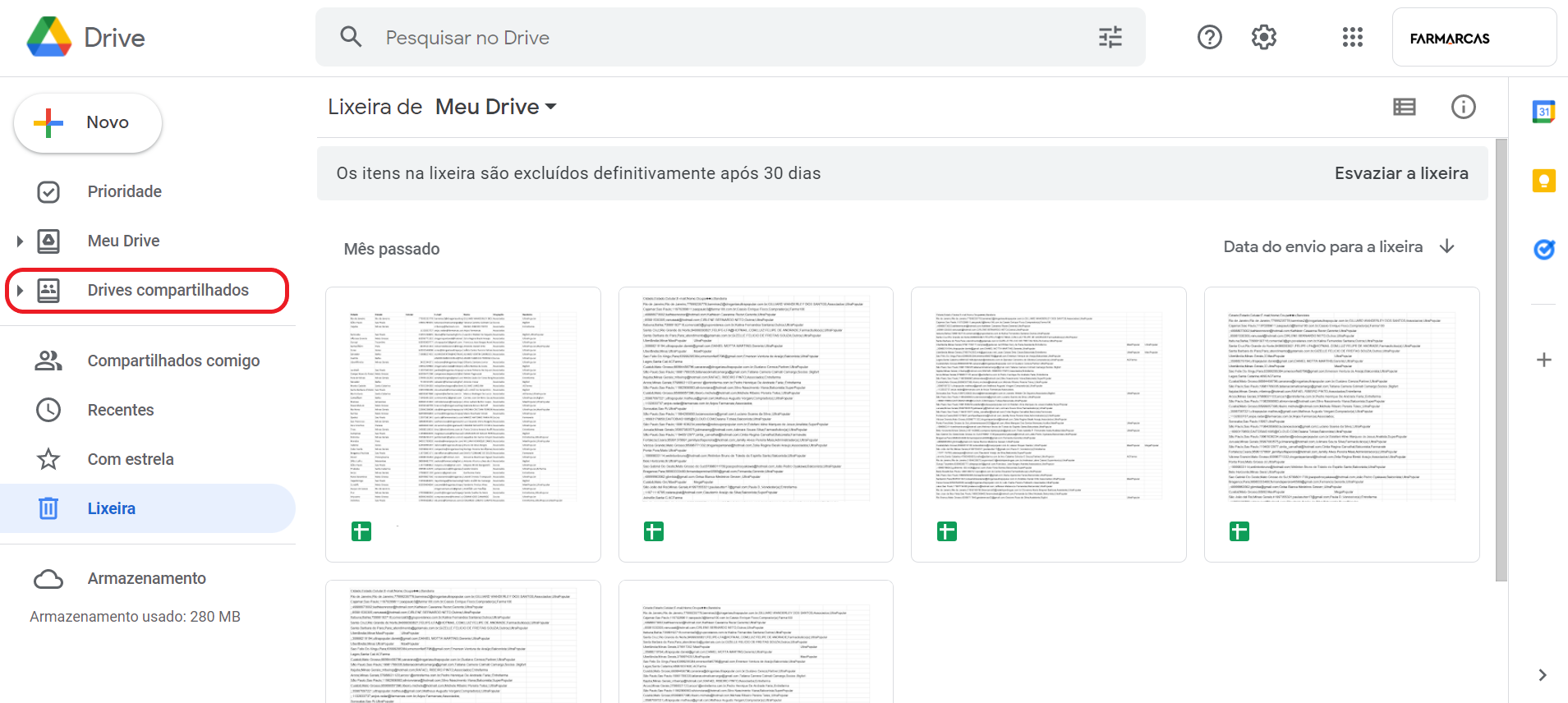 Para acessar as lixeiras do seu drive compartilhado, localize o menu lateral e clique em “Drive Compartilhado”