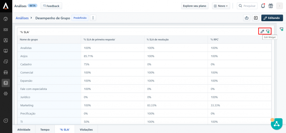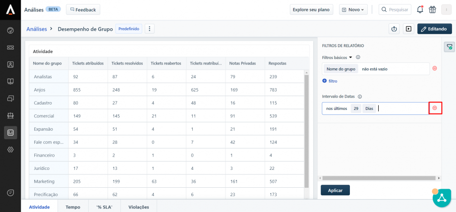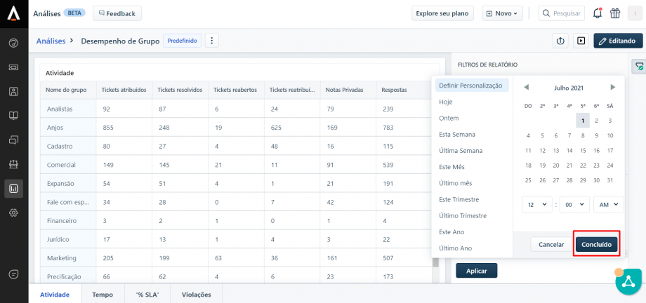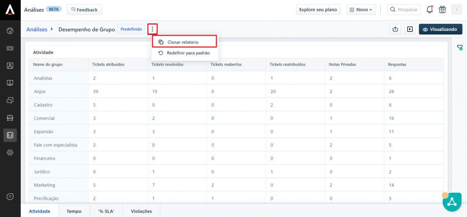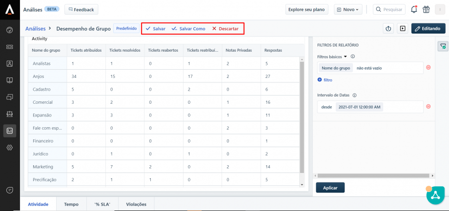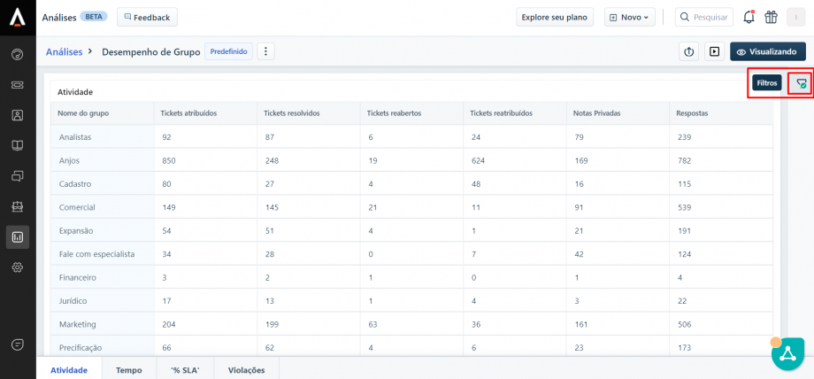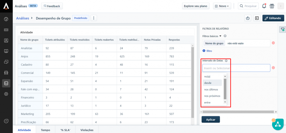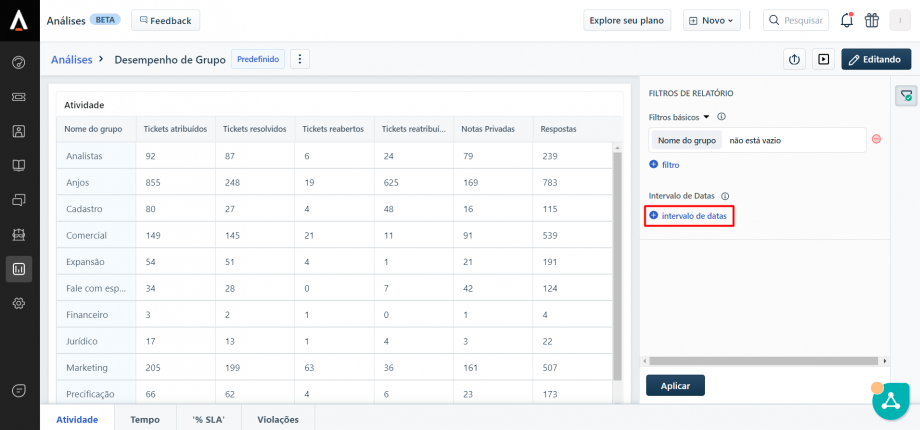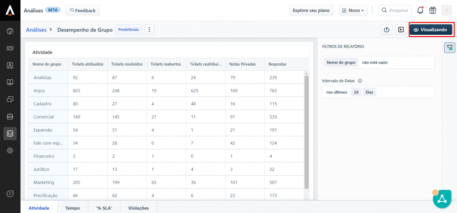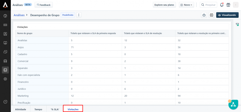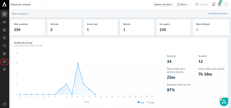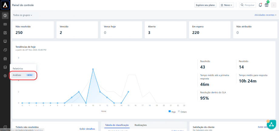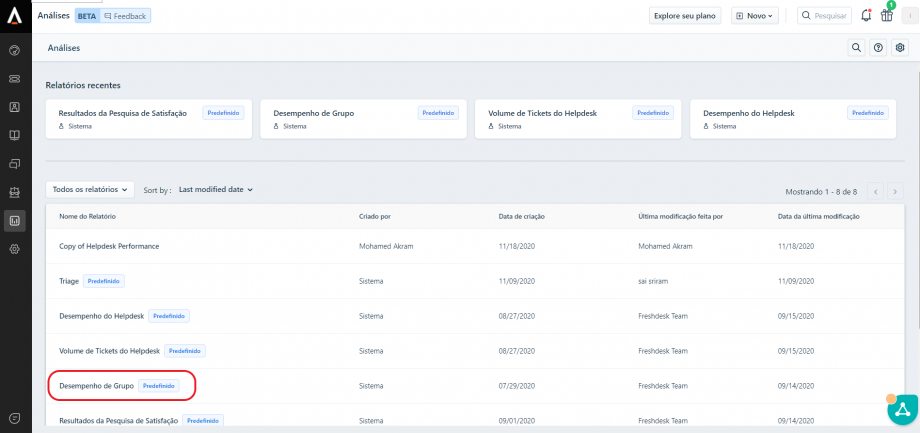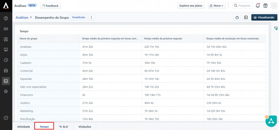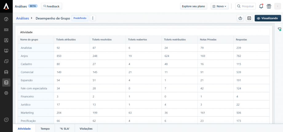 No Freshdesk é possível acessar diversos indicadores para uma análise mais aprofundada dos tickets, como o desempenho por grupo resolvedor (área), verificar o tempo médio de resposta, SLA de resposta, etc