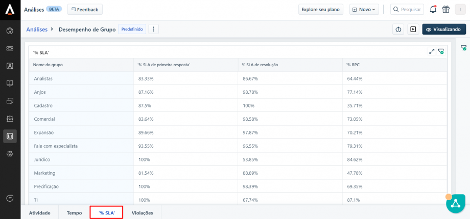 Nessa tabela, você visualiza a  % SLA de primeira resposta [lembrando que nosso SLA determinado de primeira resposta é de até 1 hora após a entrada do ticket na área], % SLA de resolução [Qual a % de tickets que estão resolvidos no período filtrado] e %RPC [Resolução de tickets no primeiro contato do associado]