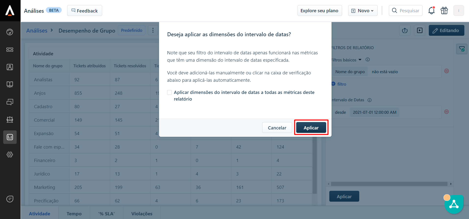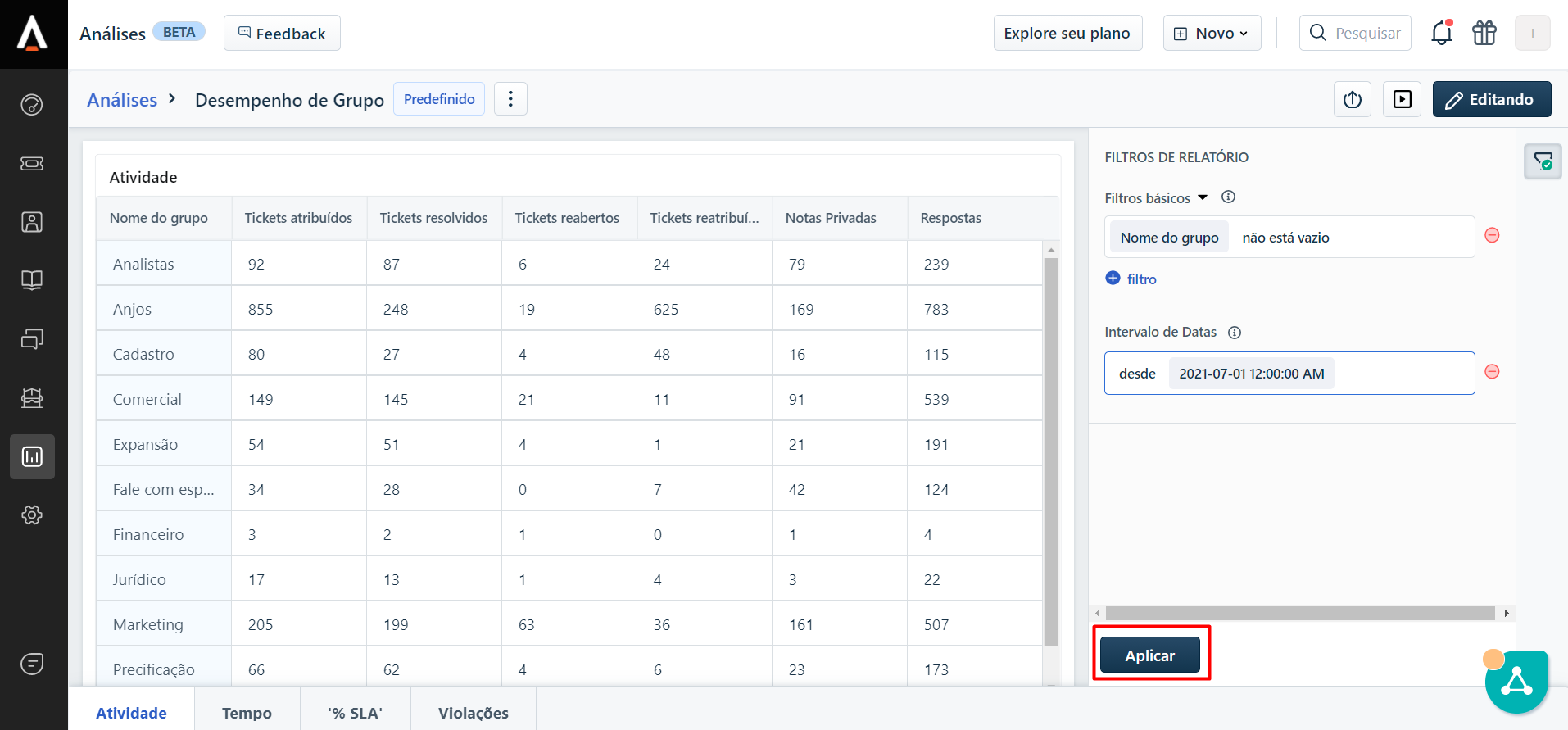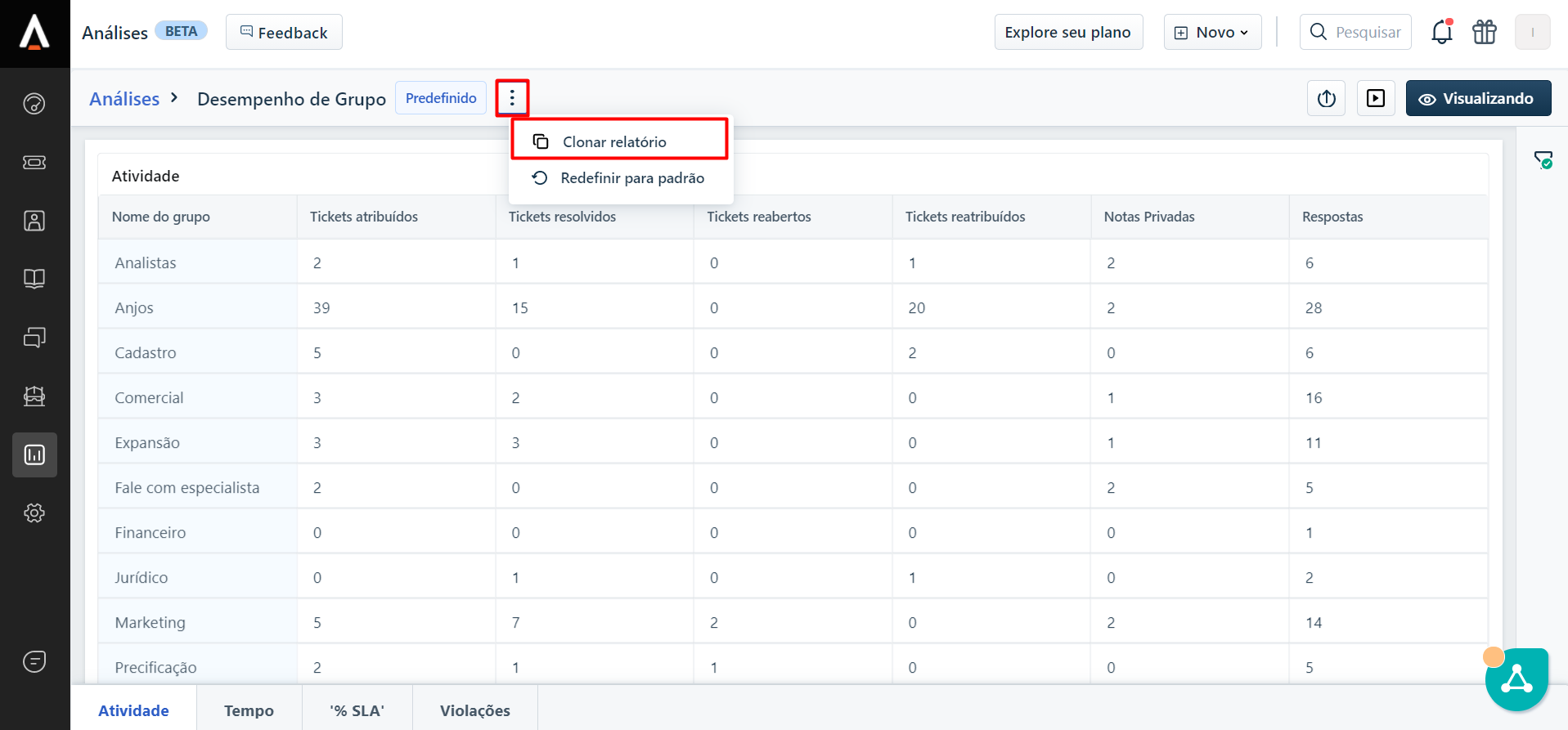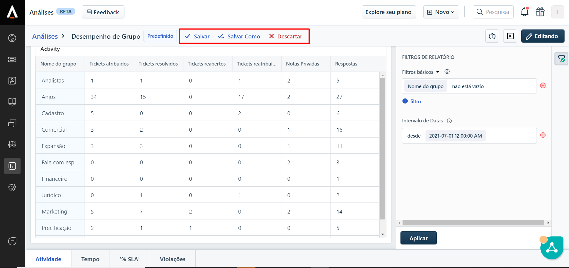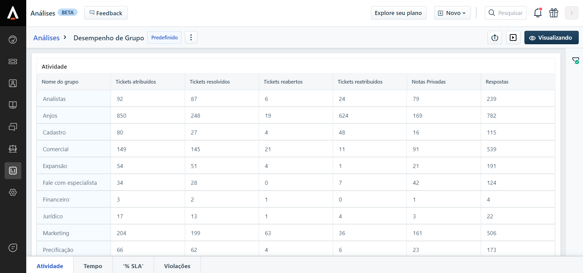 No Freshdesk é possível acessar diversos indicadores para uma análise mais aprofundada dos tickets, como o desempenho por grupo resolvedor (área), verificar o tempo médio de resposta, SLA de resposta, etc