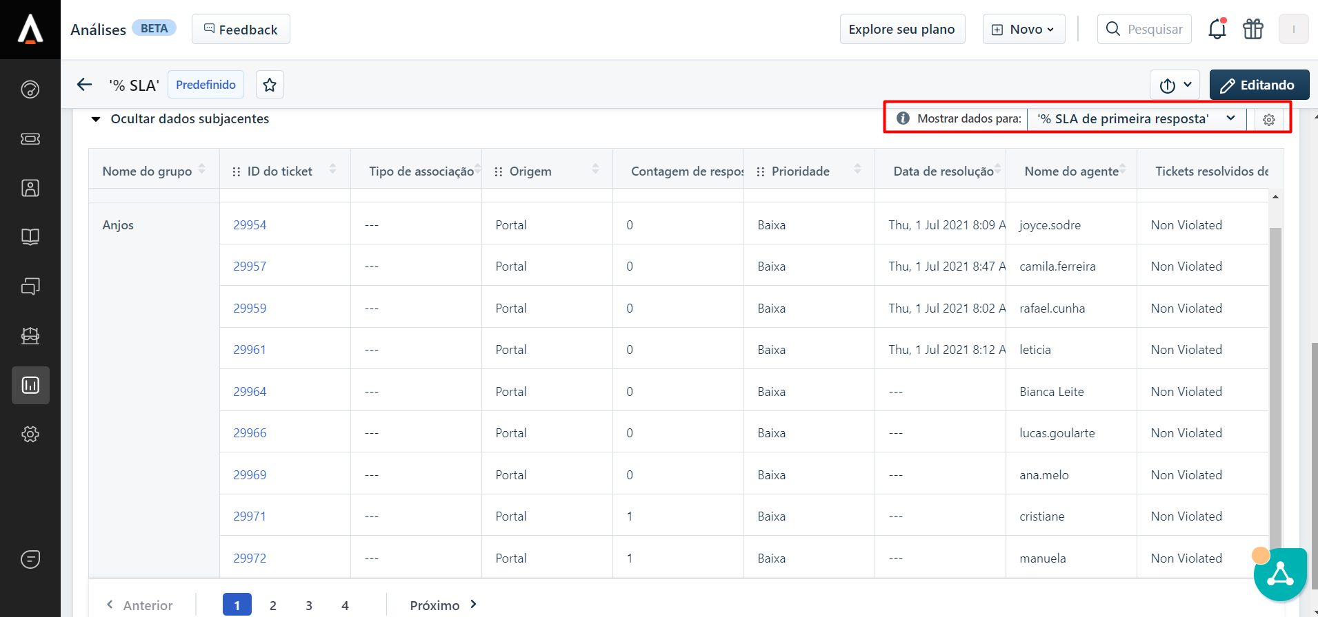 Aqui constará todos os tickets que violaram, ou seja, não cumpriram com os prazos estipulados de primeira resposta [1 hora], prazo de resolução e resolução de primeiro contato