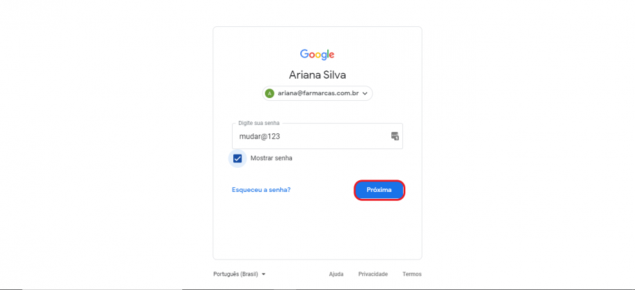 No campo “Digite sua senha” coloque a senha padrão – “mudar@123” e em seguida clique em “Próxima“.