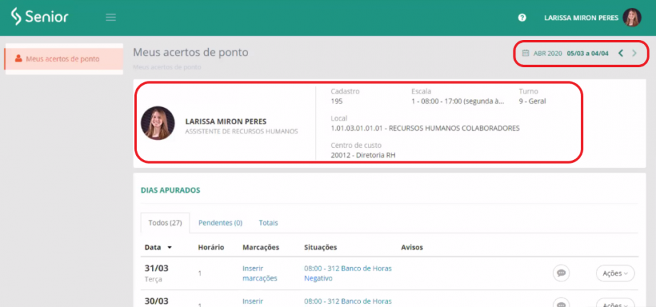 Você visualiza no topo o período das marcações de ponto e suas informações pessoais