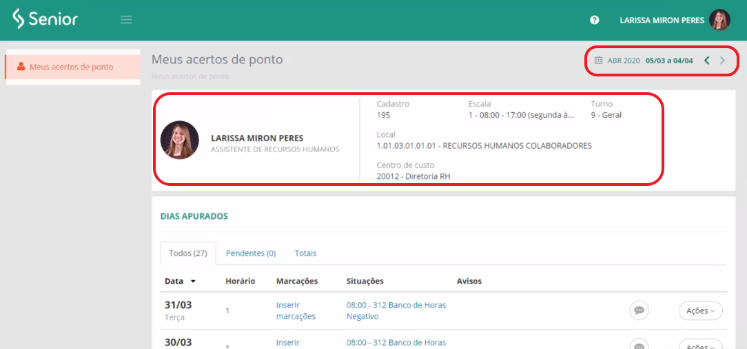 Você visualiza no topo o período das marcações de ponto e suas informações pessoais