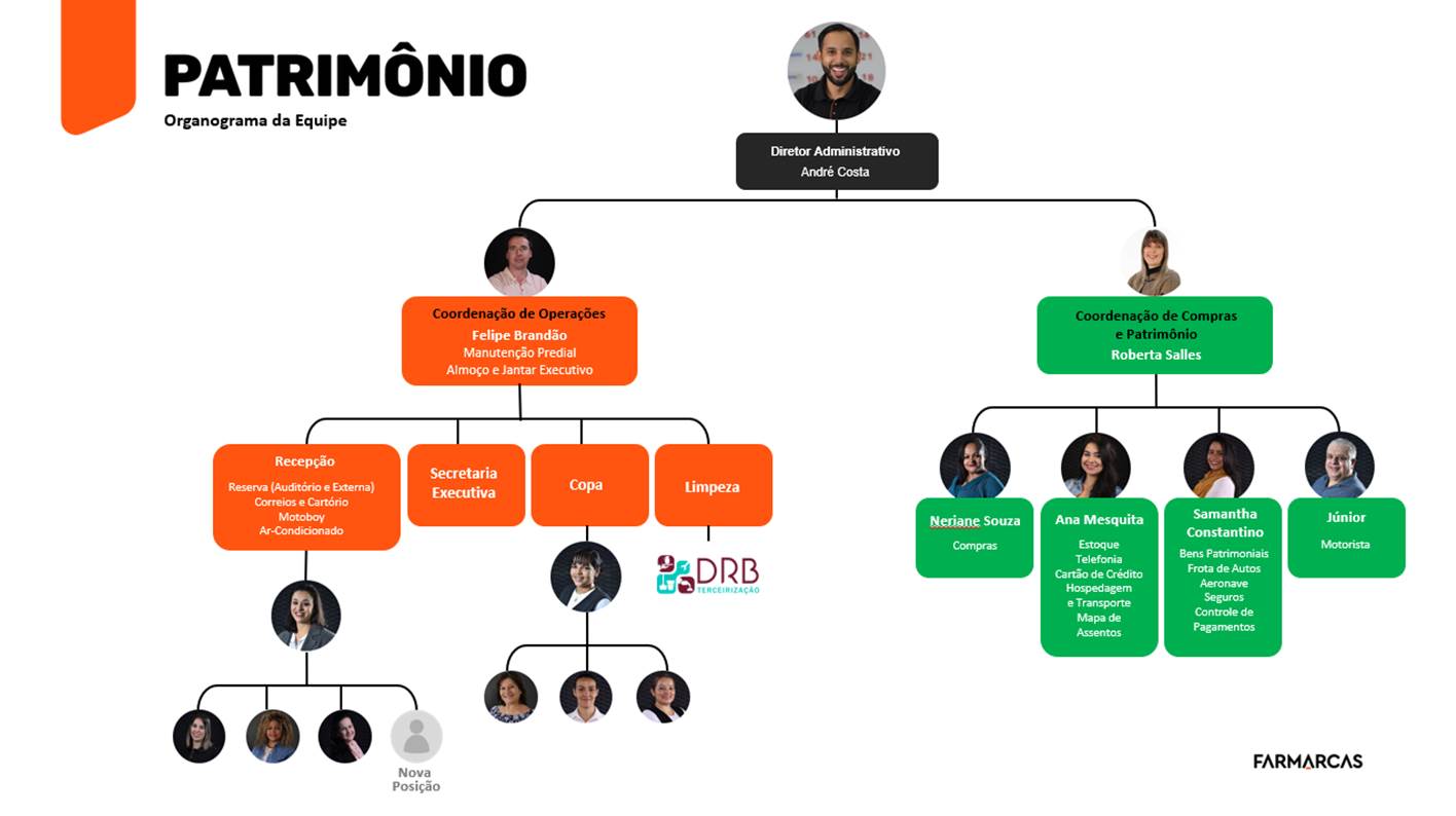 As solicitações referentes à manutenção predial e bens móveis devem ser feitas, preferencialmente, com 15 dias de antecedência pelo e-mail patrimonio@farmarcas.com.br. Demais atividades, por tarefa no Bitrix, com exceção de pedidos que podem ser feitos diretamente na Recepção.