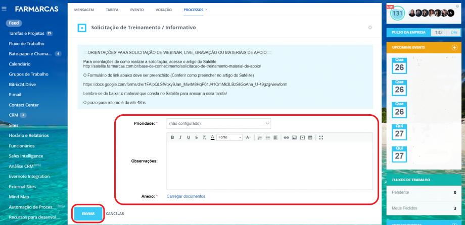Após preencher o formulário, selecione a prioridade, insira as observações e anexos necessários.