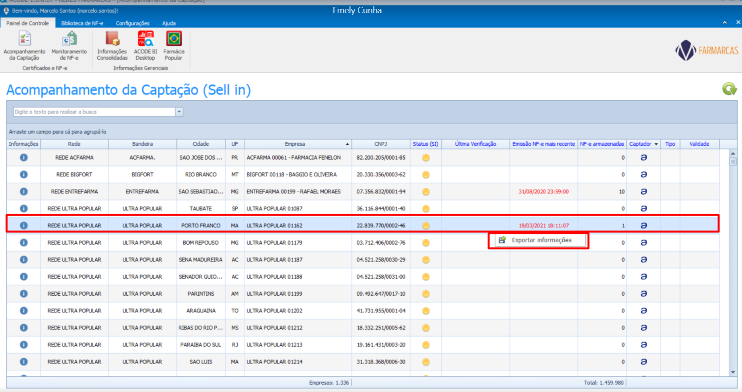 Na tela inicial, clicar com o botão esquerdo em cima de alguma loja. Em seguida na opção “Exportar Informações”