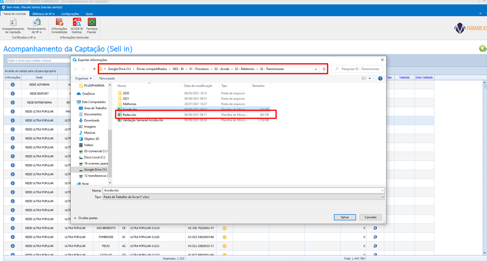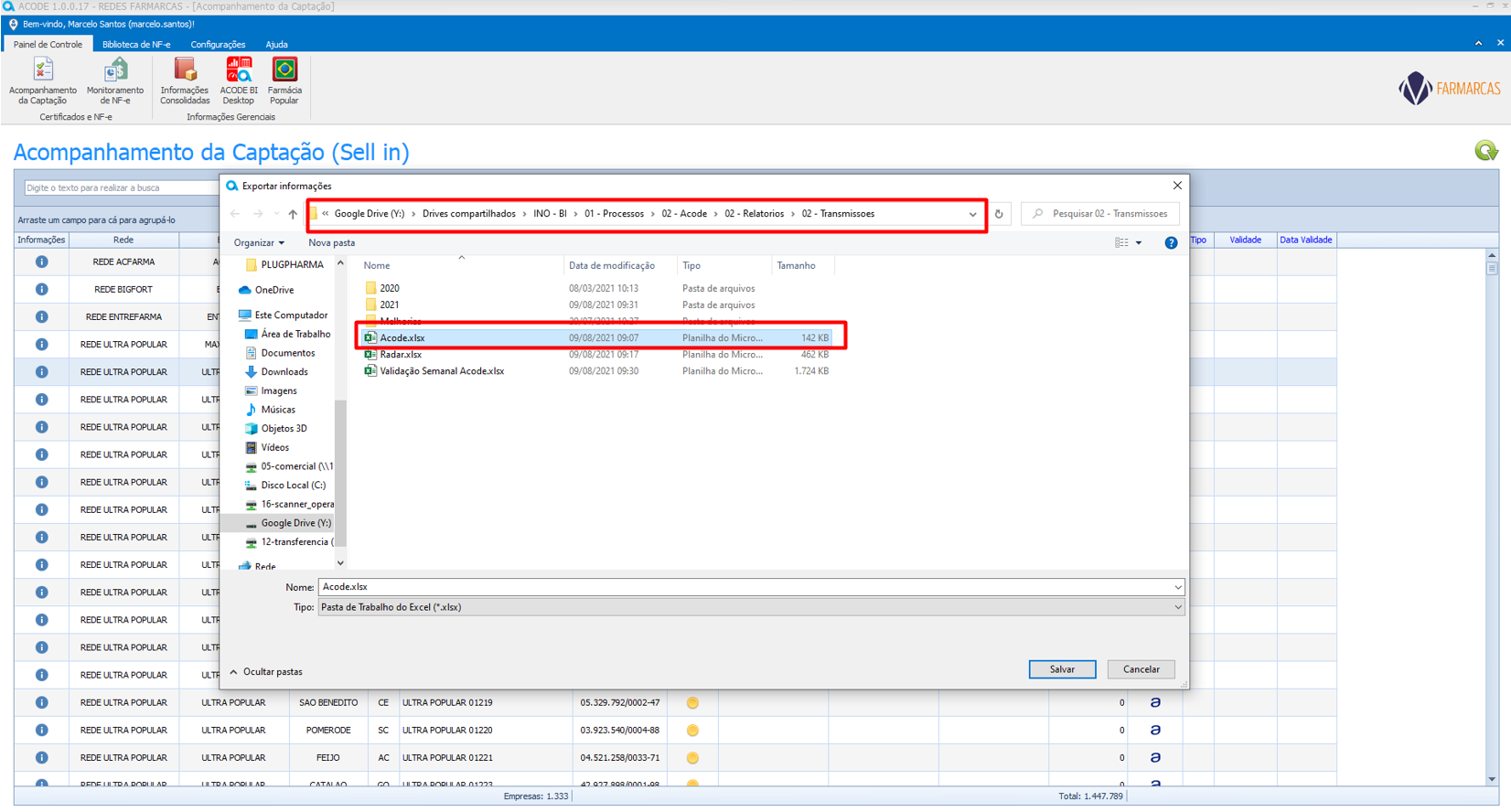 Após clicar em “Exportar Informações” salve o arquivo na pasta Y:\Drives compartilhados\INO – BI\01 – Processos\02 – Acode\02 – Relatorios\02 – Transmissoes, em cima do arquivo excel “Acode”