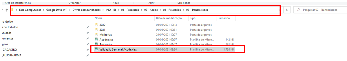 Acesse o relatório “Validação Semanal Acode” na mesma pasta (Y:\Drives compartilhados\INO – BI\01 – Processos\02 – Acode\02 – Relatorios\02 – Transmissoes)