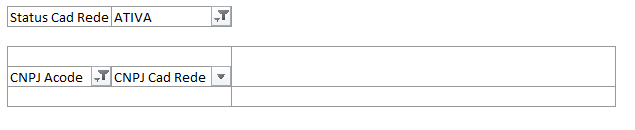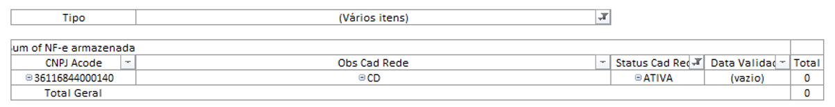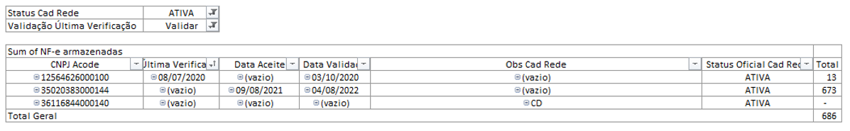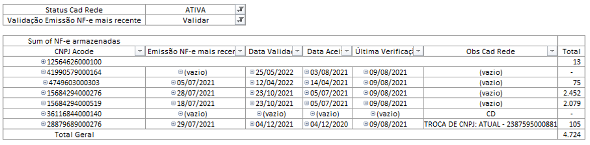 Nessa dinâmica irá constar todos os CNPJs que estão como “Ativos” no Cadastro Rede (planilha de controle de lojas interna do BI) e que não estão no Acode. Devemos entender com o anjo o motivo.