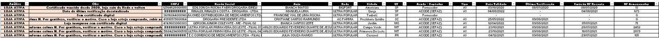 Caso nas colunas esteja a palavra “vazio”, significa que a loja está cadastrada no Acode mas não tem certificado digital inserido. Esses casos devem ser enviados ao anjo com urgência.