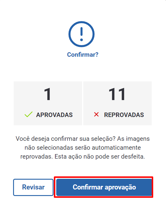 Após a aprovação da foto, será aberto uma caixa de confirmação de quantidades de fotos aprovadas e reprovadas. Verifique se a imagem condiz com a realidade e confirma a validação.